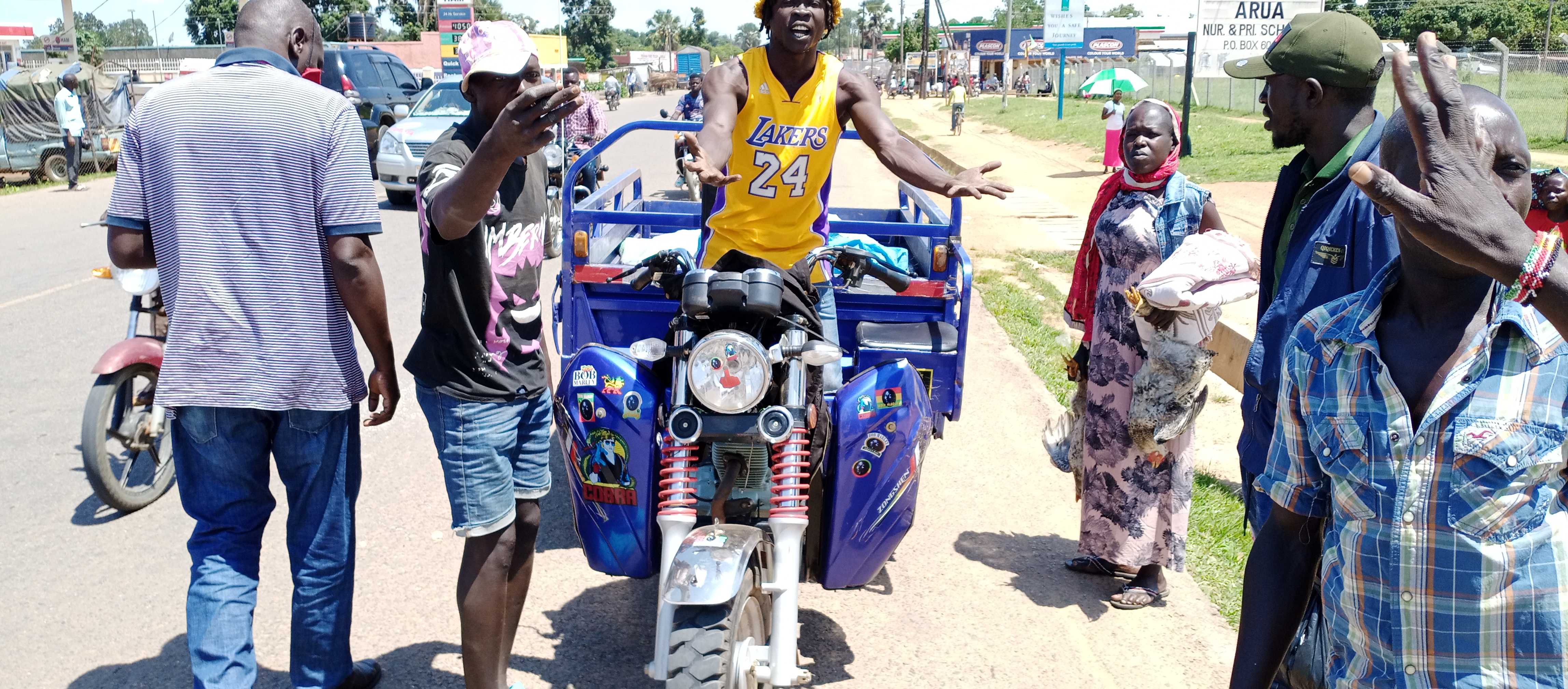 A South Sudanese refugee youth celebrates a tricycle that was handed over to him by CEEU